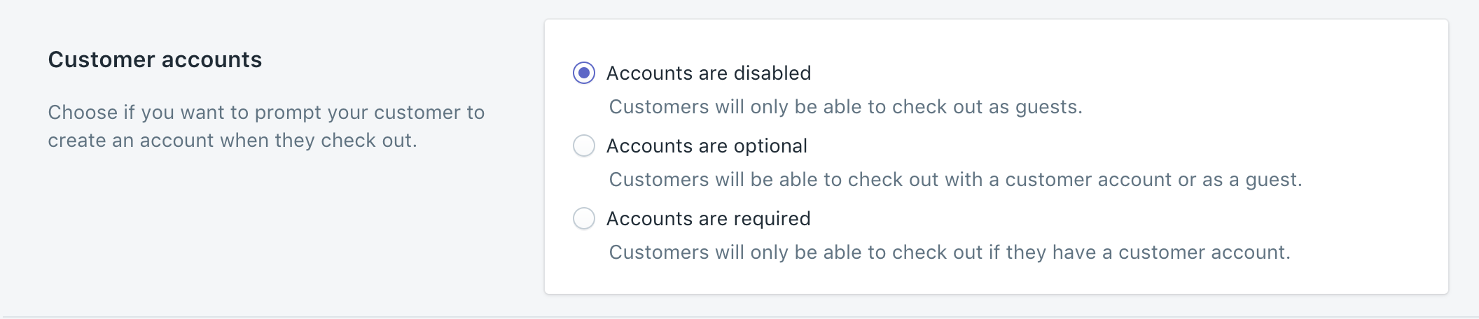 You can make customer accounts required or optional, or disable them altogether. When creating an account, customers are redirected to a separate account creation page. Keep in mind that requiring customers to create accounts might decrease sales conversions.
