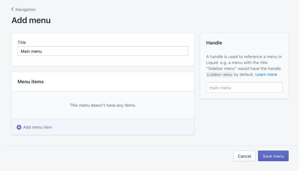 For the most part, you’ll set up and manage your store’s main menu from the Shopify admin ( Online Store > Navigation )